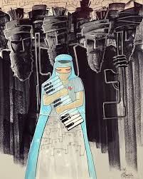 Now that women are once more in a vulnerable situation, Hassani's most recent paintings appear to be losing their hue. Titles like Nightmare and Death to Darkness make it clear how she feels. The Taliban are portrayed in her works as ominous, dark entities who tower over the landscape. Her paintings feature blue-clad women wearing burqas or headscarves. There is a black container with a dandelion in two parts. Perhaps representing a wish that is blowing out of reach, dandelion whisps fly away.