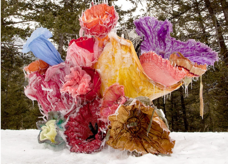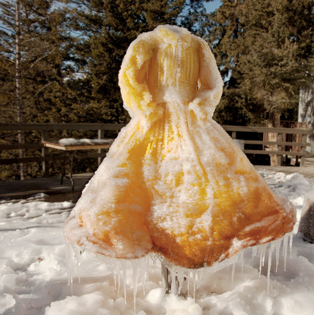 Nicole Dextras is an artist from British Columbia who makes striking installations with a cold twist. Dextras has created a line of Frozen Textiles that explores themes such as ephemerality and environmentalism. These textiles turn regular clothes into hanging icicles, ice blocks, and even a gigantic bouquet. Inspired by fantastical folktales and science fiction alike, Dextras' dreamy Bouquet installation embodies his fascination with reinterpreting the natural world. Dextras used only a spray bottle filled with water and the icy temperatures of Alberta to freeze a variety of fifteen 1940s and 1950s dresses. Each piece of clothing was gradually covered in ice over several days, turning their frills and full skirts into fabric petals. Dextras created a massive bouquet full of the “bright colours and the delicate details found in the biodiversity of the natural world” after each dress underwent this enchanted transformation. As predicted, this flower arrangement did not survive forever; according to Dextras, "It made its big splash in the wintery forest and within a few days it was gone."