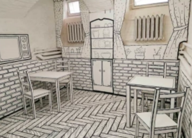 “Since then, our customers have been delighted! People come to us specifically to take unusual pictures. Our employees are also enthusiastic about the work and some have even been waiting months for vacancies.” Drawings of indoor plants, windows with curtains, rows of books, framed paintings, an oven, a clock and much more hang on the walls of the café. In addition, guests can interact with some installations, such as the "flat" piano or the "drawing" of the telephone.