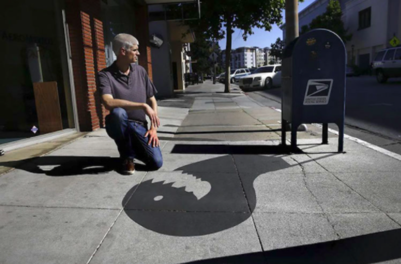However there is one thing that he enjoys above the rest, and that is playful street art projects that gives ordinary objects silly and surprising shadows. Belanger was commissioned to spice up the streets of downtown Redwood City, California, and bring some creativity to the streets and passersby. With his imagination and skills with a paint brush, Belanger created 20 imaginative public piece.