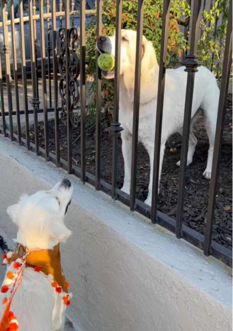 “Lady would keep it if she could. We take it from Lady and give it back, otherwise they will have no balls left!” Adorable Lady is now always super excited when it is time for her walk so that she can see her best friend. And it is clear that this little routine between Lady and Nikko makes both of them so happy. “She drags us to their house every day [and] gets up on the fence to see if either of them are out.”