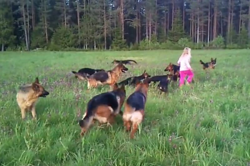 VIDEO: THIS LITTLE GIRL HAS A BLAST HANGING OUT WITH HER BESTIES...14 GERMAN SHEPHERDS