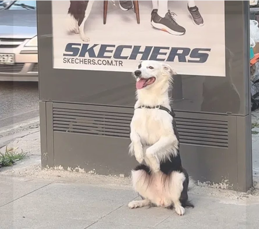 A Cute Dog Spots Herself In a Street Advertisement And Instantly Goes To Pose Next To It