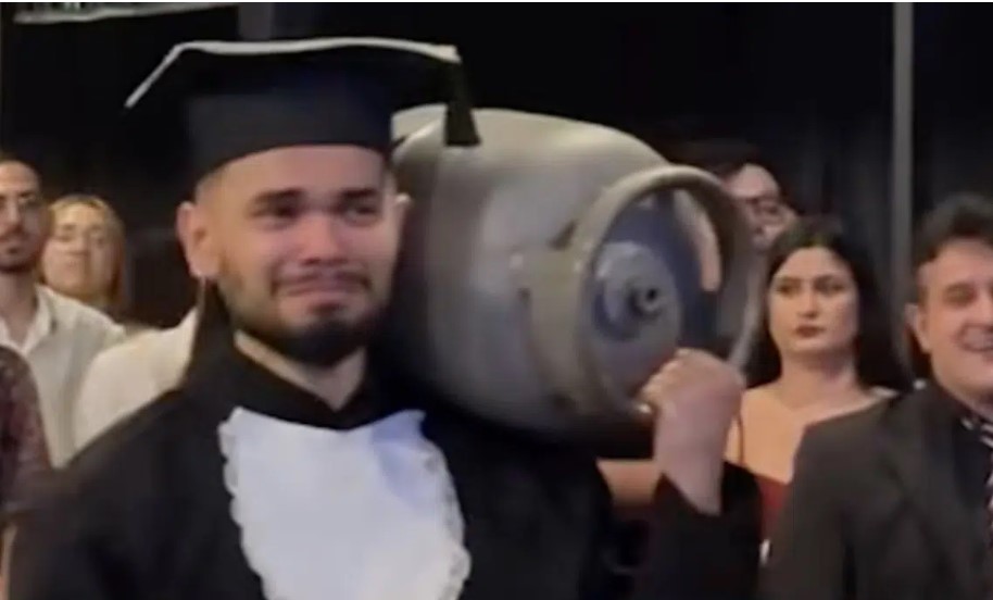 A Graduate Honors His Father's Work By Carrying a Gas Tank While He Goes To Pick Up His Diploma