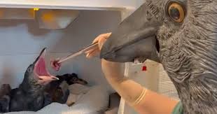 Caretakers Wears Raven Masks To Prevent Orphaned Ravens From Imprinting On Humans