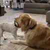 Golden Retriever Finds Smart Way To Calm His Little Energetic Brother Down