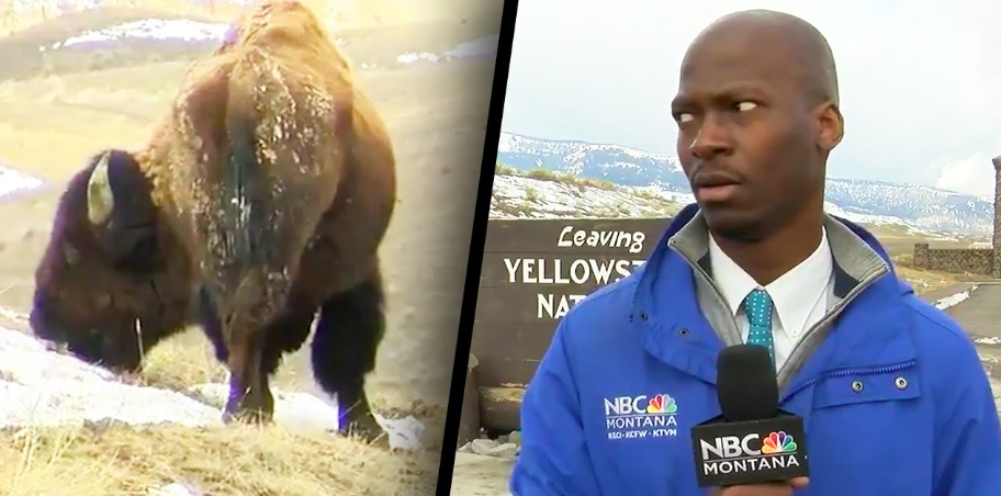 Reporter Has Hilarious Reaction To a Herd Of Bison Approaching